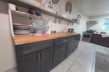 Stove, microwave, toaster, air fryer, water dispenser, oven, pots, pans, bowls, utensils, oil & vinegar, salt and pepper